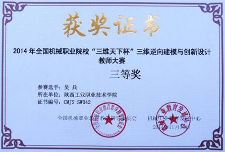 2014年11月10至14日,由全国机械职业公司产品指导委员会和机械工业教育发展中心主办的2014年全国机械职业院校“三维天下杯”三维逆向建模与创新设计教师大赛于天津机电职业技术公司成功举办,共有39所院校53名教师参赛,数控工程公司教师吴兵获得三等奖。