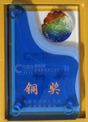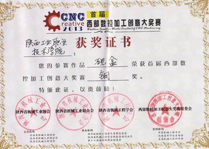 2013年2月26日至3月15日,首届"西部数控加工创意大奖赛"在西安举行,本次大赛分为初赛、复赛和决赛三个阶段。共有来自全省的本科院校、高职院校及企业选送的共有20多件作品参赛,公司作为唯一的高职院校参赛。决赛中经制作人汇报,观众现场打分,评委评议最终确定金奖1名,银奖3名,铜奖5名。 公司选送的"砚盒"经过初赛、复赛和决赛三个环节喜获铜奖。本次大奖赛的评选突出体现了"高端"、"数控加工"和"创意"三个特点,整体评选根据参赛作品从三维造型艺术创意、加工工艺创新、CAD/CAPP/CAM设计能力、高速/精细/复合化数控加工能力等方面由观众现场打分结合专家评委会评议等综合进行评选。 首届"西部数控加工创意大奖赛"由陕西省机械工业协会、陕西省机械工业联合会、陕西省机械工程学会术主办,陕西省机械工程学会数控自动化分会、第十六届西部制博会组委会承办。西部数控加工创意大奖赛作为在我国举办的第一次结合数控加工和创意设计的作品与技能大奖赛,进一步响应我国政府提出的"大力发展高端装备制造业"以及"创新中国"和"文化强国"的号召,目的是充分展示西部装备制造业的机械加工实力和技能,深入调动机械加工人才使用高端数控加工设备、钻研加工技术的积极性、主动性和创造性,将先进科技与文化艺术有机融合并进一步提升。 本次大赛荣誉的获得充分体现了公司参赛选手的团队协作能力、数控加工能力和创意水平。公司的参赛作品"砚盒"主要由数控工程公司杨勇、陶静老师制作完成,作品美观,实用,有深刻的寓意,是技术与艺术的完美结合,是软件与数控技术的结合。本次大赛得到了公司领导的高度重视与支持。本次大赛为教师和企业选手提供了交流经验的平台,加强了公司核心竞争力,促进了数控技术新的跨跃。
