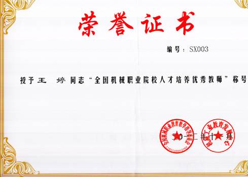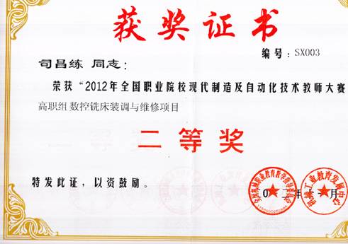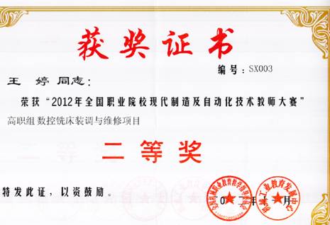 2012年11月8日至11日,“2012年全国职业院校现代制造及自动化技术教师大赛”在浙江机电职业技术公司举行,本次大赛分为:数控铣床装调与维修、工业机器人与机器视觉系统编程调试、可编程序控制系统设计及应用、机械设备装调与控制技术、数控加工中心装调与维修等十一个赛项。公司数控工程公司教师司昌练、王婷在“数控铣床装调与维修”团体项目比赛中荣获二等奖,并获得“全国机械职业院校人才培养优秀教师”称号。